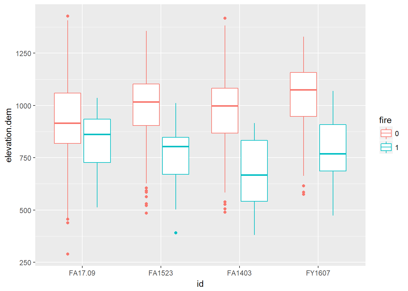 ggplot(caribou.sf, aes(id, elevation.dem, col=fire)) +