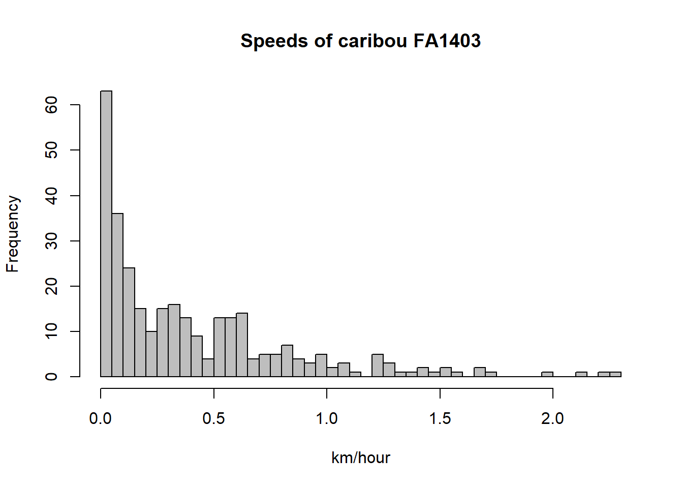 hist(Speed/1000, breaks = 50, col = "grey", xlab="km/hour", main="Speeds of caribou FA1403")