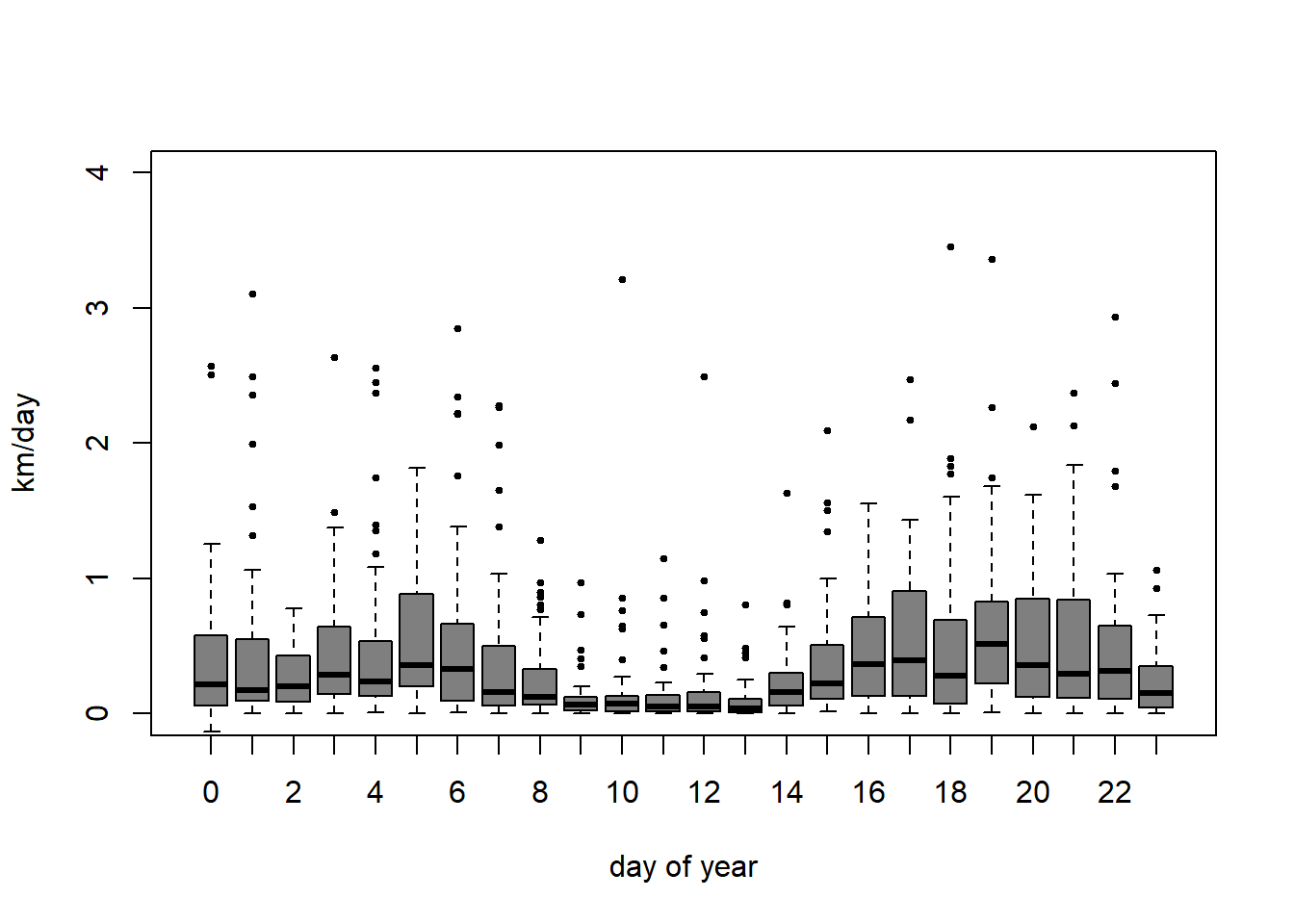 ylim = c(0, 4), ylab = "km/day", xlab="day of year", pch = 19, cex = 0.5, col = rgb(0, 0, 0, 0.5))