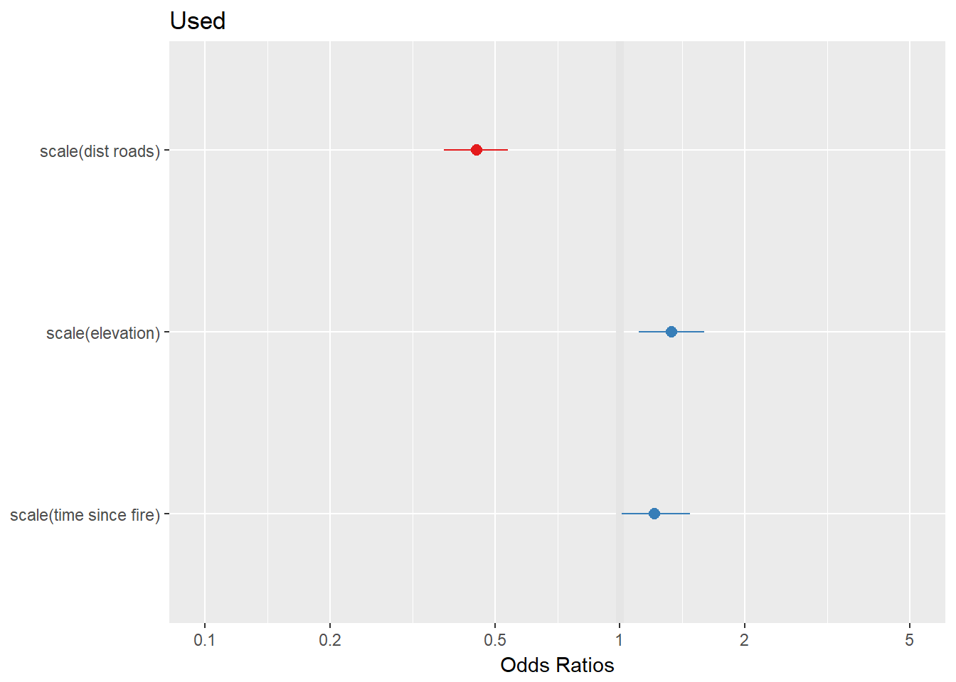 We can run a conditional logistic regression comparing covariates at used points those at random points. Notice we are centering and scaling our covariates so they are easily comparable on the same scale.
