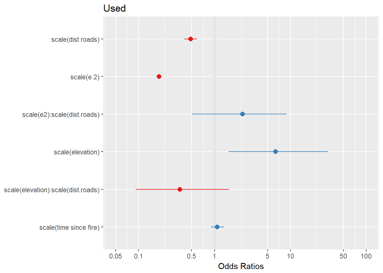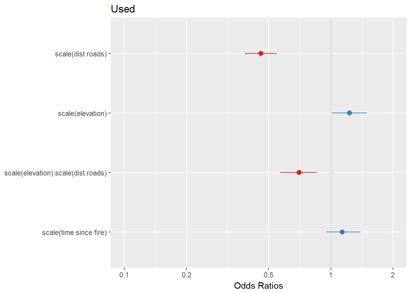 RSF.fit2 <- glm(Used ~ scale(elevation) * scale(dist.roads) + scale(time.since.fire), data = Data.rsf, family = "binomial")