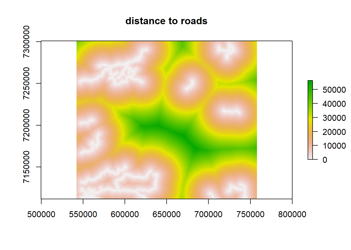 plot(fmch.habitat[[3]], main = "distance to roads")