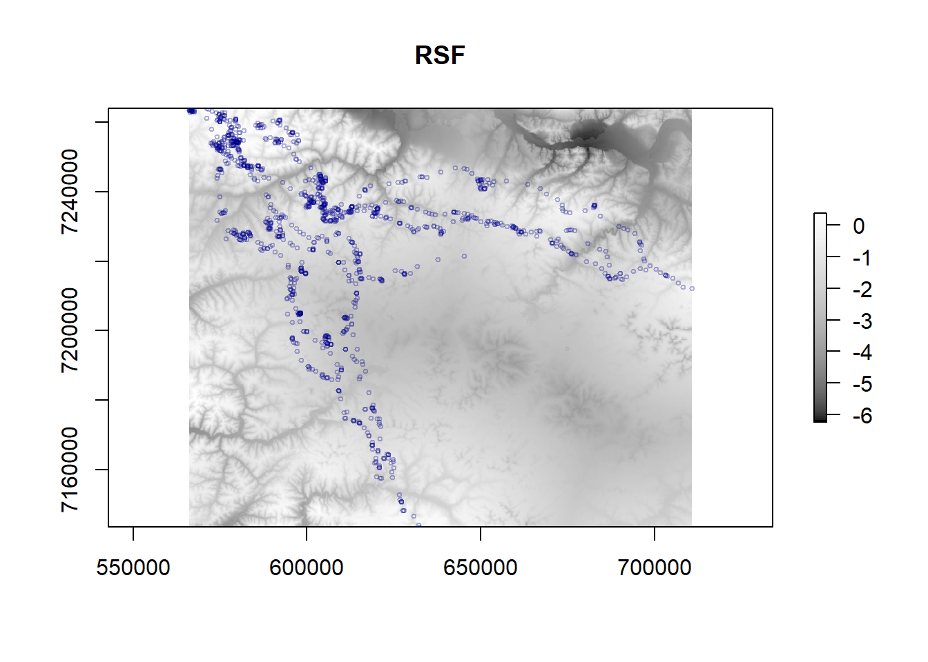 To estimate the RSF, we simply use a logistic regression. simple glm with a “binomial” link, because our used variable is “TRUE” or “FALSE”
