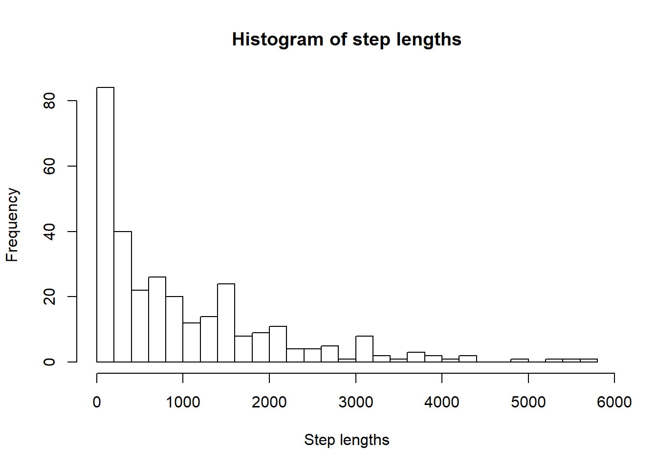 Similar to before, we are using the map function, applying the step_lengths function from amt to each of the track objects. After generating step lengths, let’s look at a histogram of them.