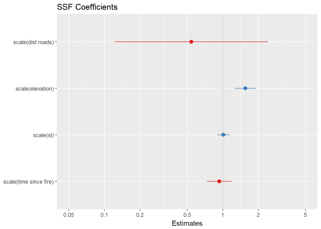 ssf.1 <- clogit(case_ ~ strata(step_id_) + scale(elevation) + scale(time.since.fire) + scale(dist.roads) + scale(sl_), method = 'approximate', data = ssf1)