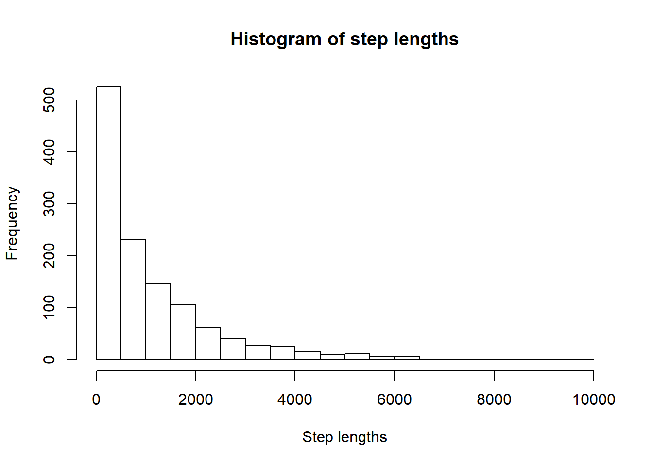 hist(step.lengths, breaks = 20, main="Histogram of step lengths", xlab="Step lengths")
