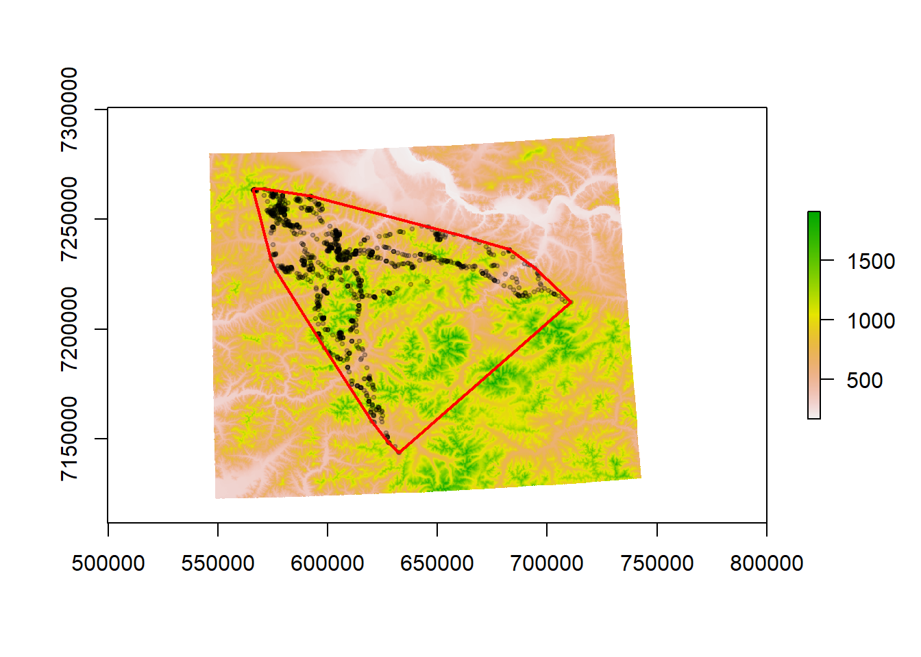 This chunk of code loads the caribou data frame, converts it to a SpatialPointsDataFrame, and plots the caribou object over elevation, constructs an MCP that encompasses 100% of the used points, and plots the MCP: