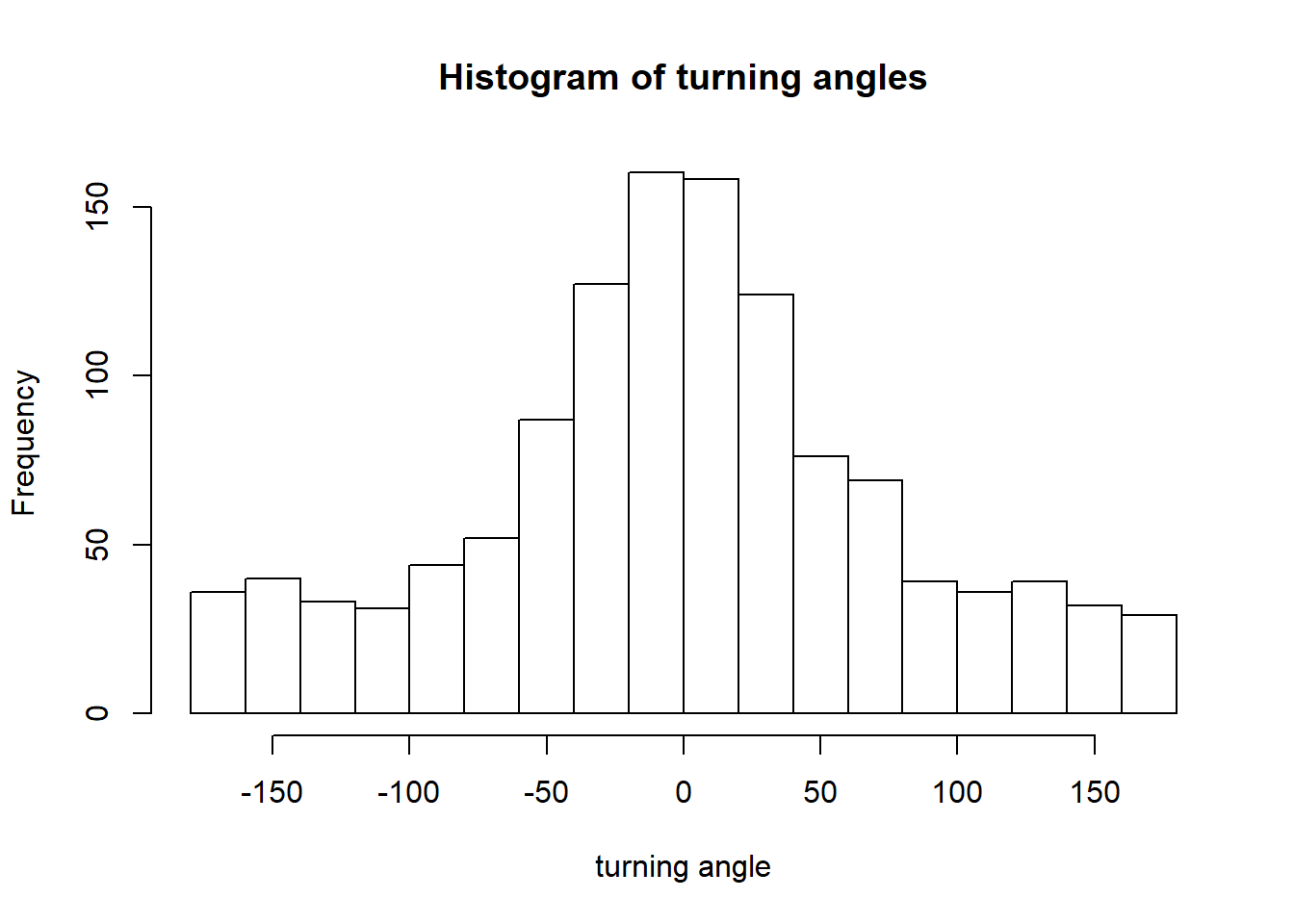 If there were big time intervals between some successive locations, we might want to break the track up into bursts, and then we wouldn’t calculate distances and turn angles across bursts. Looks like the sampling rate is always around at 2.5 hours with not much deviation, so for simplicity, we won’t do this now.