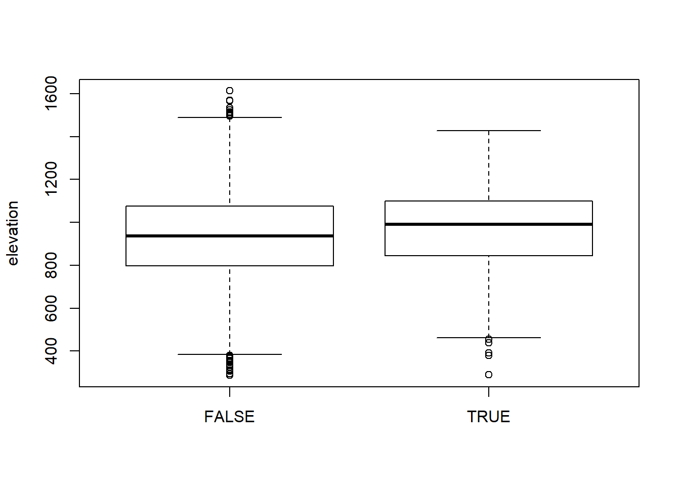 boxplot(elevation ~ Used, data = Data.rsf, main = "elevation")