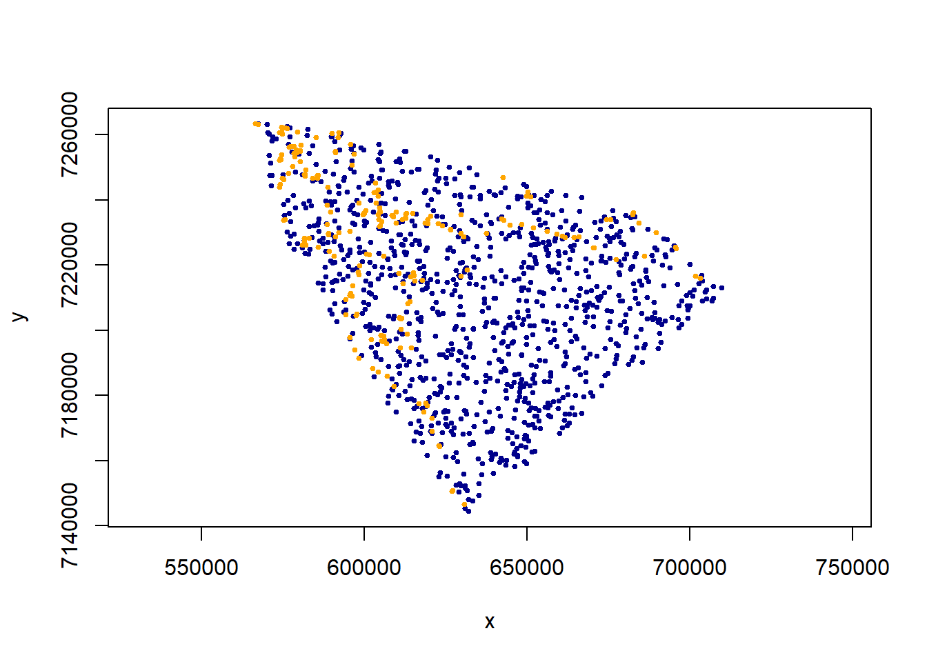 points(xy.obs, pch = 19, col = "orange", cex = 0.5)