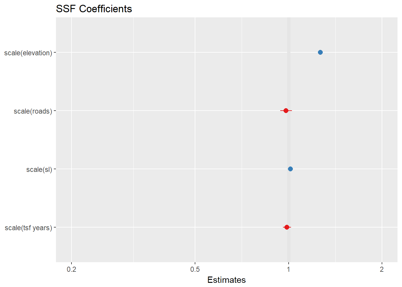 SSF2 <- clogit(case_ ~ strata(step_id_) + scale(elevation) + scale(tsf.years) + scale(roads) + cluster(id) + scale(sl_), method = 'approximate', data = steps.sp)