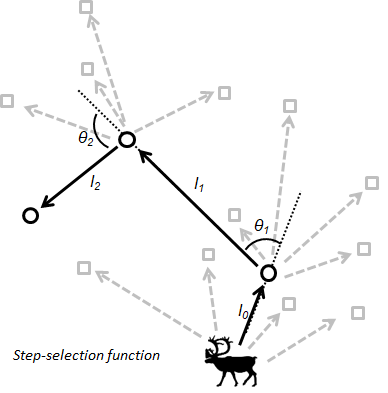 In this lesson we will analyze caribou resource selection with respect to elevation, time since fire and distance to roads. We’ll start with a simple point-based resource selection function (RSF), and then move to a path-based step selection function (SSF). The basic idea is to figure out what habitat covariates caribou are selecting (or avoiding). Assuming that some resources are actively selected over other resources, the RSF attempts to quantify that selection for (or avoidance of) each. The strategy is simple: - Collect data on used locations - Define and collect data on available (but not necessarily used) locations - Perform a logistic regression.