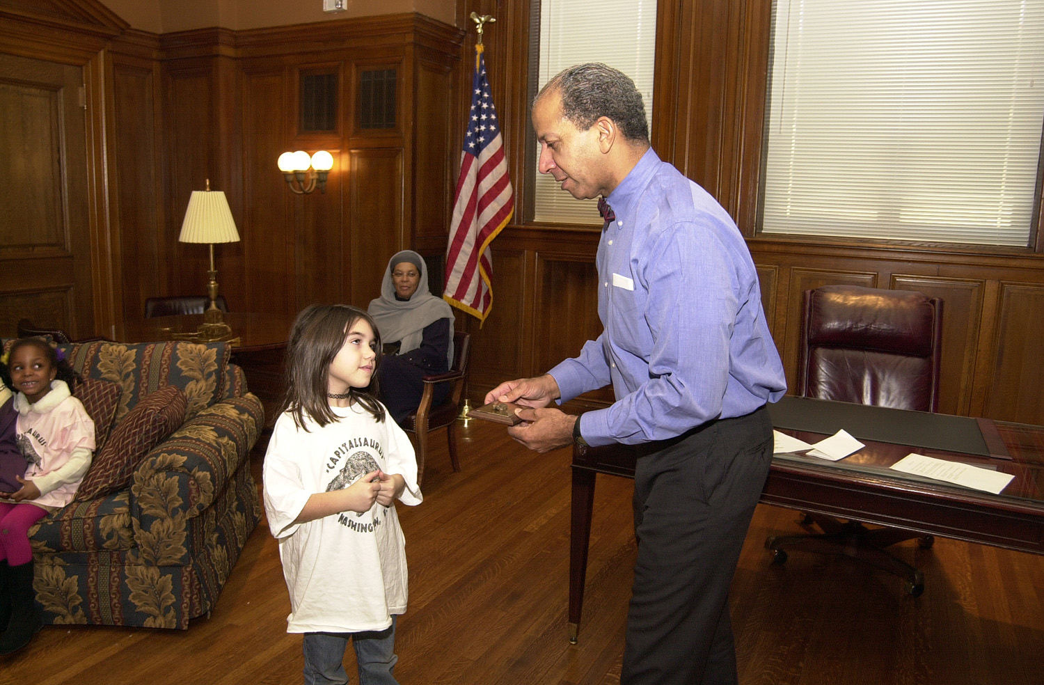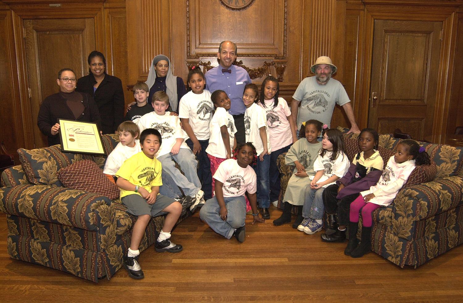 Capitalsaurus Day was a great success. It is held annually on January 28th marking the date the fossils were accessioned at the Smithsonian. This year's ceremonies included students and teachers from Smothers and Watkins Elementary Schools, representatives from the offices of Kevin Chavous (Ward 7) and Sharon Ambrose (Ward 6) and Dr. Kranz of the Dinosaur Fund. Announcements were made about the placing of the signs at Capitalsaurus Court and the new raptor from D. C. Everyone sang the "official" Capitalsaurus Song. The events were covered by printed TV media, in particular, FOX Channel 5 and News Channel 8.