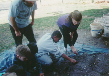The students from Mrs. Henderson's Montessori class at the school, examine the clay carefully for dinosaur fossils because as Dr. Kranz has told them, it is always better to find a fossil sooner than later. The longer a fossil is handled, the greater the chance it will be damaged.