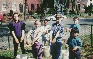 The "Junior Palenotologists" asemble their tools for their dinosaur fossil search. They have 5 gallon buckets, sieves and a garden hose. |