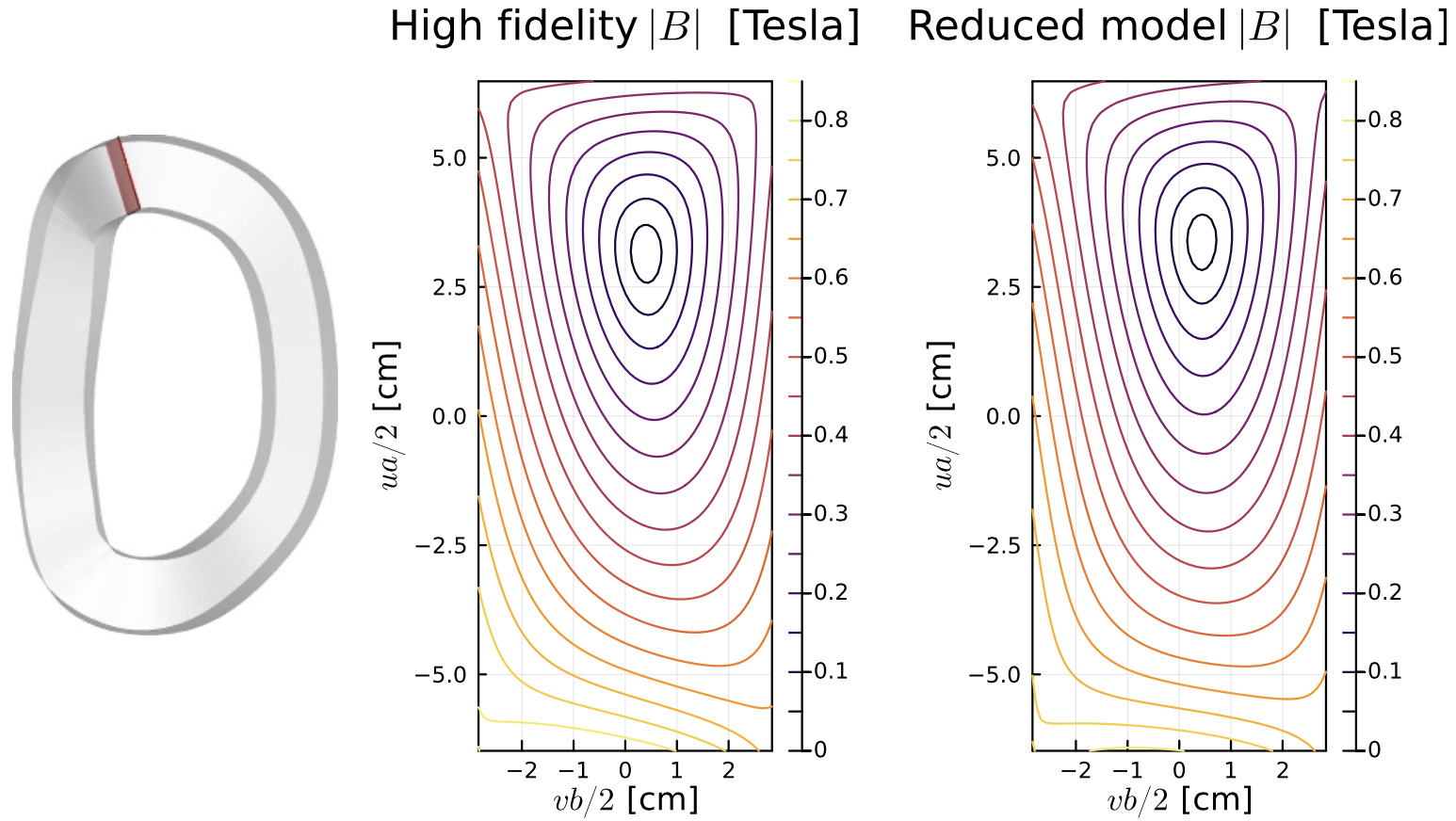 One concern for magnetic fusion systems is the large Lorentz force on the coils. Another concern is the field strength inside the magnets, which determines the critical current for superconductivity. For these force and internal field calculations, the coils cannot be naively approximated as infinitesimally thin filaments due to divergences when the source and evaluation points coincide, so more computationally demanding calculations are usually required, resolving the finite cross-section of the conductors. Our group has devised a new alternative method that enables the internal magnetic field vector, self-force, and self-inductance to be computed rapidly and accurately within a 1D filament model, Figure 2. The reduced model is derived by rigorous asymptotic analysis of the singularity, regularizing the filament integrals such that they match the true high-dimensional integrals at high coil aspect ratio. This work is led by PhD student Siena Hurwitz, and has been presented in several recent papers: Hurwitz (2023), Landreman (2025), and Hurwitz (2025). In the last of these, Siena demonstrated that the reduced model allows for Lorentz forces to be reduced using derivative-based coil shape optimization, Figure 3.