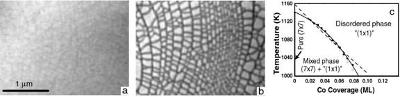 ![Text Box: Figure 2. Cobalt on Si(111). (a) The clean Si surface was confirmed to be an ordered (7x7) reconstruction from its diffraction pattern. (b) After 0.02 monolayer had been adsorbed, the dark regions appeared. They were a disordered lattice-gas of Co-containing clusters that segregated to steps (the longer lines) and domain boundaries (the shorter lines). (c) A clear phase boundary separates a region of coexistence from a pure disordered phase. Solid dots indicate the temperatures at which the surface disorders on heating and open squares indicate the temperatures at which the phase coexistence appears on cooling. The solid curve shows a fit to the Clapyeron equation including a repulsive interaction between Co-containing clusters in the disordered phase. The dashed straight line is for the noninteracting case (Adapted from reference [3]).](LEEM_PhysicsToday_files/image019.gif)