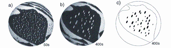 Wolfgang Theis, Bartelt and Tromp [6] also studied the “ripening” which occurs at sufficiently high temperature, as larger islands grow at the expense of smaller islands on the surface. The well-known Gibbs-Thomson effect, in which the chemical potential of an island is proportional to the inverse of its radius of curvature, explains the ripening. Fig. 3(a) and (b) show LEEM snapshots of how a configuration of islands coexisting on the surface has evolved. One might have guessed that the time dependence of the sizes of islands on the surface could be predicted from a mean-field model in which a uniform chemical potential described the sea of atoms diffusing from island to island. As it turns out, this idea is nearly correct: Starting with a refined approximation – allowing the chemical potential in different cells around each island to take on different values, depending on island sizes - the model becomes essentially perfect. Compare the experimental measurement in figure 3(b) with the results from the computations in Fig 3(c). What’s striking is that the refined model successfully predicts not merely average island properties as a function of time. In fact, the model is sufficiently accurate to predict the histories of the individual islands, which the LEEM images allow to be followed in detail, as they ripen over time.