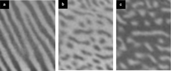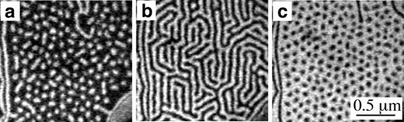 stripes (0.38 monolayer), and (c) inverted droplets (0.48 monolayer).