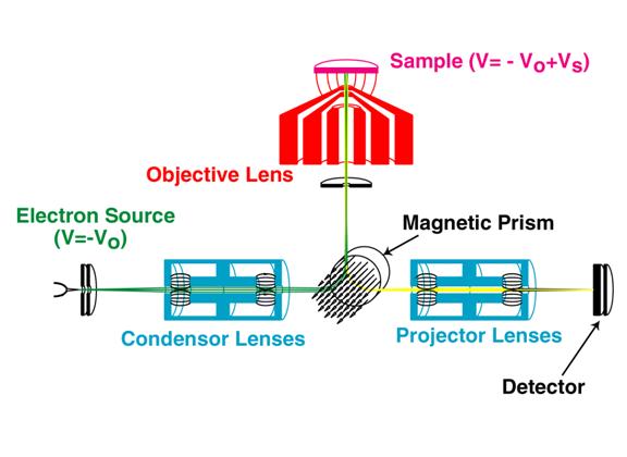 Nevertheless, the backscattering geometry is a challenge for LEEM instrumentation design. The column containing the illumination optics and the column containing the imaging optics both have to be arranged in front of the sample surface. In fact, for best imaging conditions it is often desirable that the illuminating beam and the reflected image beam share a common optical axis in the direction normal to the sample surface. Therefore a beam-separation element is needed somewhere along that optical axis. In most LEEM’s, a magnetic sector (B in the figure) is used to bend the illuminating beam onto the axis normal to the sample surface. Electrons reflected from the sample travel back on the same axis to reach again the prism, where they deflect further, into an imaging column that is separate from the illumination column.