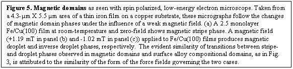 How magnetic microstructure responds to changing conditions of temperature or externally applied fields is an important questions both for applications and basic physics. Using a SPLEEM at Lawrence Berkeley Lab, Helmut Poppa and one of us (Schmid) recently demonstrated the feasibility of operating a SPLEEM while simultaneously applying a controllable magnetic field to the sample [10]. A particularly interesting case of field-dependent magnetic domain patterns occurs in thin film samples which have a magnetic anisotropy perpendicular to the film. Fig. 5 (a) shows a typical SPLEEM image of the zero-field domain structure of a 2.5 monolayer thick film of Fe on Cu(100) at approximately 42°C. Under these conditions, the sample magnetization alternately pointed up and down in a regular pattern of dark and bright stripe domains. When a weak, perpendicular magnetic field is applied perpendicular to the plane-parallel and antiparallel to the magnetizations of the stripes- stripe domains whose magnetization aligned with the applied field simply grew in width at the expense of the anti-aligned stripes. One might imagine that, as a function of increasing field, the aligned stripes would continue growing and eventually form one single large domain. However, that did not happen. In sufficiently large field, typically at around 1 mT for the temperature and film thickness in the experiment, the stripe domain patterns became unstable and we found transitions to magnetic droplet and inverse droplet phases.