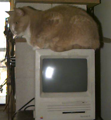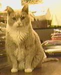 is a spayed female, about 14 pounds, who came to me when it looked like Sam was getting a little weird from being left all alone in my apartment all day. She likes eating and sleeping, especially in the sun. She is a night person and often doesn't even get up before I've left in the morning. Her favorite spot is on the foot of my bed. She is orange tabby with sporadic white markings.
